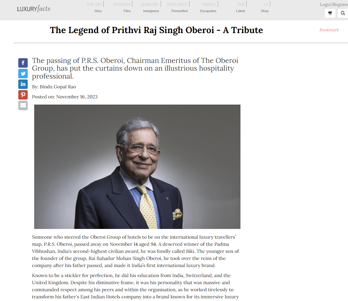 Writing a tribute to someone like PRS Oberoi who redefined India’s luxury hospitality landscape is quite daunting, considering his lofty achievements.