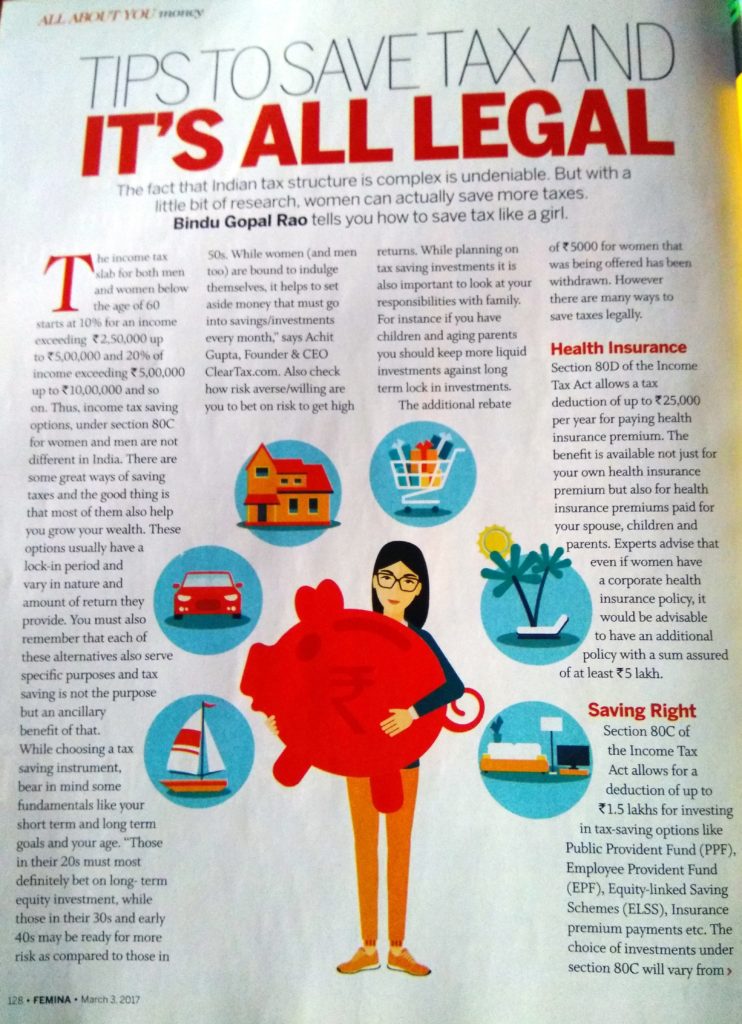 The additional rebate of Rs. 5000 for women that was being offered has been withdrawn. However there are many ways to save taxes legally and these can actually help you make your hard earned money work for you. Let us take a simple example. If your Total income, including salary and any other income is Rs. 10 lakh per annum you can make investments under Section 80C amounting to Rs. 1.5 lakhs, under Section 80CCD(1B) for Rs. 50,000 and under section 80D for Rs. 30,000 which will give you a total taxable salary of Rs. 7.7. lakhs. This way you have to pay tax on only Rs 7.7 lakhs! This means that you can actually save taxes to the extent of Rs. 47378! If you are wondering how – the tax slab of 20% on Rs 10 lakhs comes to Rs. 1,28,749 and on Rs 7.7 lakhs comes to Rs. 81,371. So if you want to know how to save taxes read on.