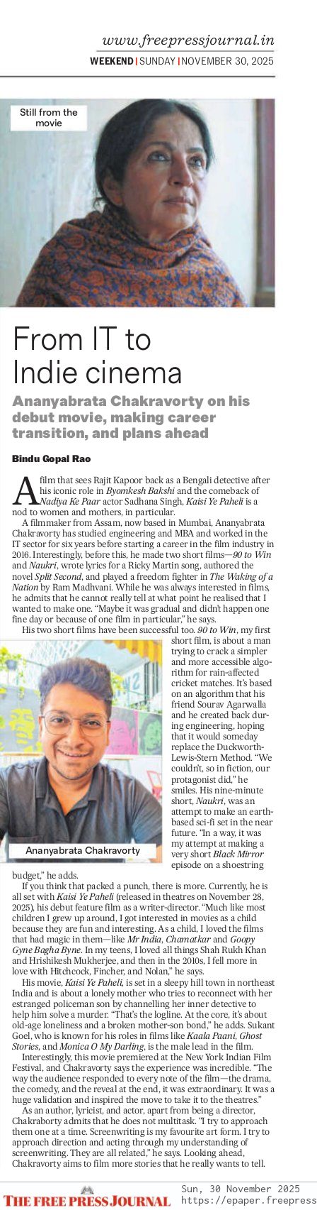 Ananyabrata, a writer-director from Assam and now based in Mumbai, holds degrees in engineering and business administration. His debut feature, Kaisi Ye Paheli, follows his short films 90 to Win and Naukri. He also authored the novel Split Second and wrote the Hindi lyrics for Ricky Martin’s Vente Pa’ Ca.
