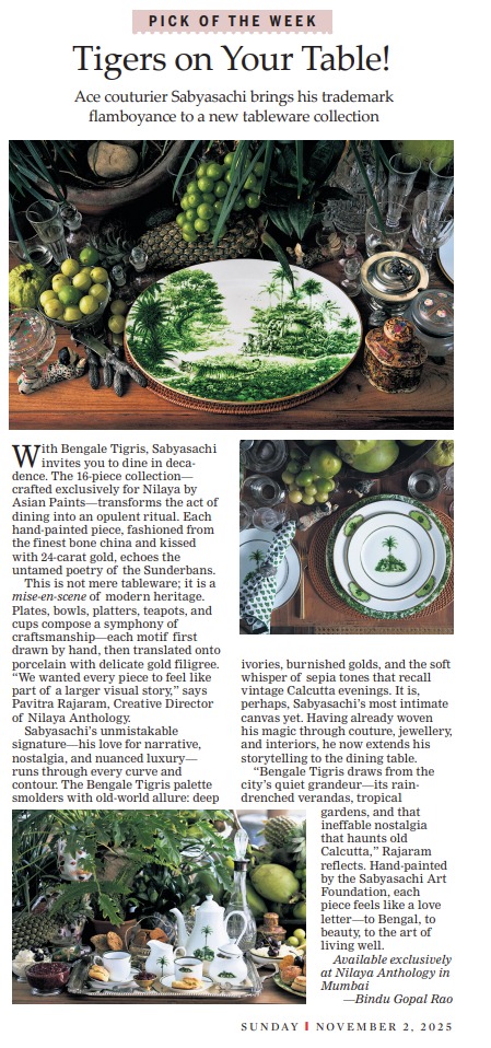 This launch represents a continuation of Sabyasachi’s partnership with Nilaya Anthology, following the debut of his Art Foundation at the space earlier this year. It underscores a growing movement toward immersive design, where interiors and objects come together to create a cohesive cultural narrative. The collection celebrates a multisensory experience, imagining a table set amid floral arrangements, crystalware, and ambient fragrances, where dining becomes an art form in itself.