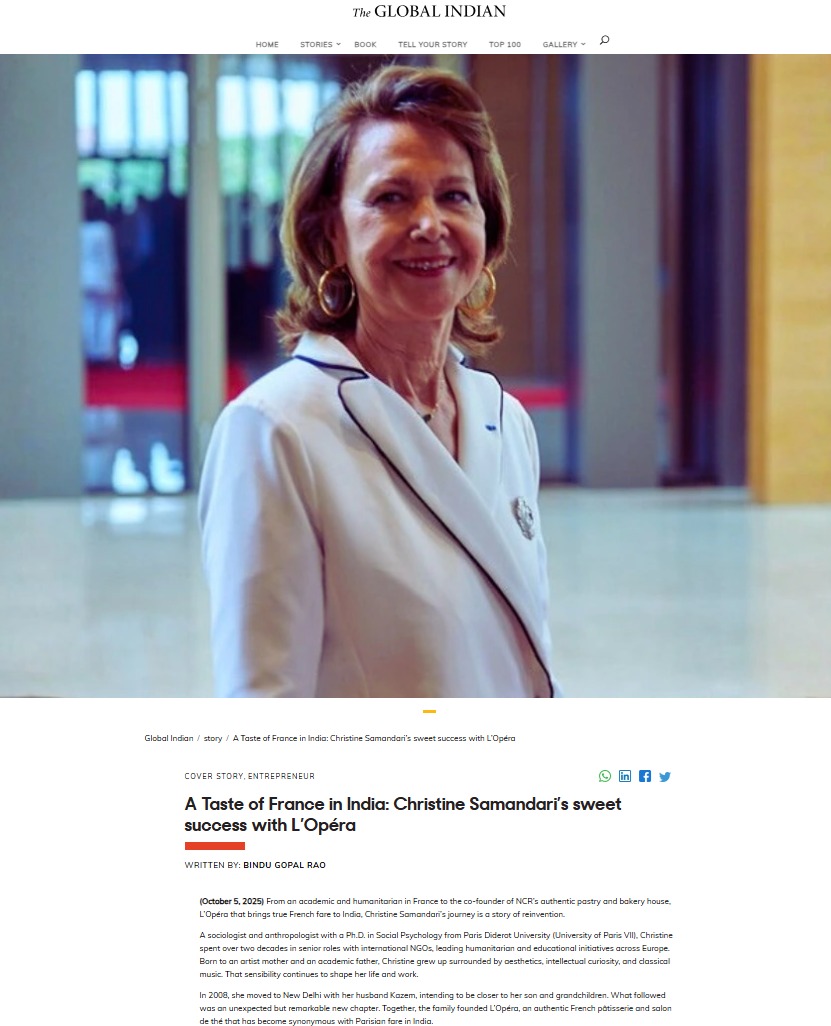Christine Samandari, co-founder and Director of L’Opéra, an authentic Pastry & Bakery House, Salon de Thé and Café Restaurant, specializing in French products in India. Since its inception it has always stood for quality and excellence. Christine was born to an artist mother and an academician father. She has a Ph.D. in Social Psychology and a MA of Anthropology and Sociology. She is married and has two children and two grandchildren. Christine has served the society in a variety of capacities over the last thirty years. Prominently from 1988 until 2008 as the Head of the European and Francophone Branch of the Bahá’í International Community’s Office of Public Information, in Paris. Christine has travelled extensively, given numerous talks and lectures and participated in many radio, television, and press interviews. In 2008, Christine and her family moved to New-Delhi India where she started a new career as an entrepreneur and social activist. In 1994, the French Government elevated Christine to the rank of “Knight” in the prestigious “National Order of Merit”.