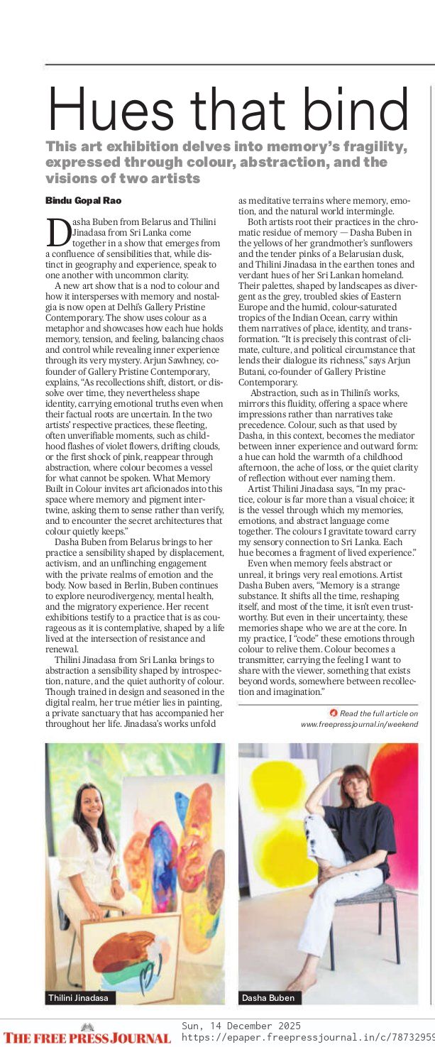 What Memory Built in Colour is a new exhibition at Gallery Pristine Contemporary, featuring Berlin-based Belarusian artist Dasha Buben and young Sri Lankan contemporary artist Thilini Jinadasa.