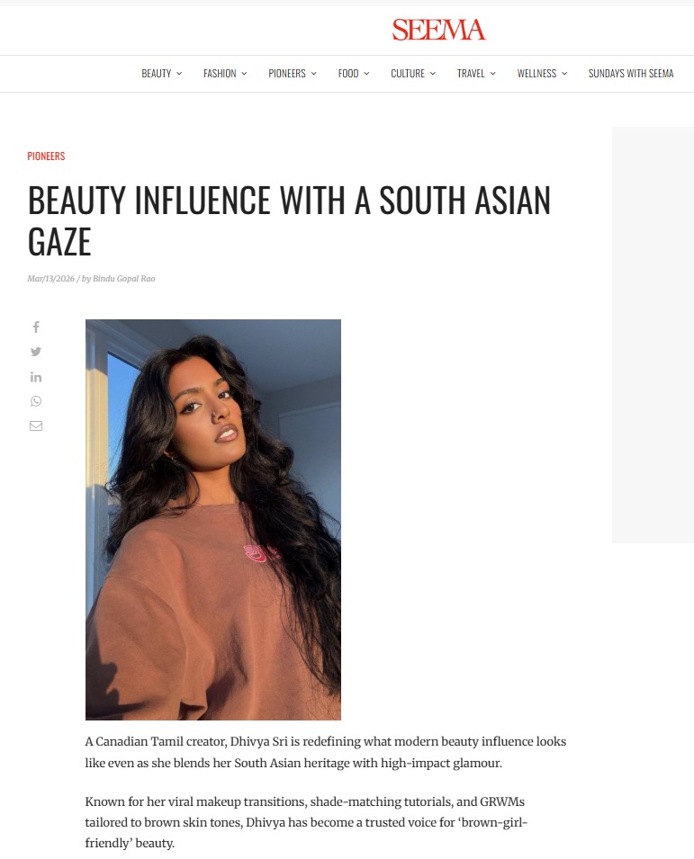 More than a creator, Dhivya is an advocate for expanded representation of brown-skinned and South Asian talent in mainstream beauty and fashion media. Her platform is rooted in empowerment—encouraging her audience to embrace identity, culture, and confidence unapologetically.