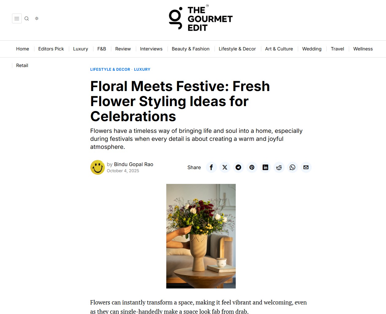 Flowers bring an effortless charm to celebrations, especially when styled in traditional vessels. A brass urli at the entrance filled with water, marigold petals, and floating candles instantly creates a warm festive welcome. Smaller brass utensils filled with fragrant jasmine or vibrant roses can be placed across tables and corners, turning everyday spaces into festive nooks.