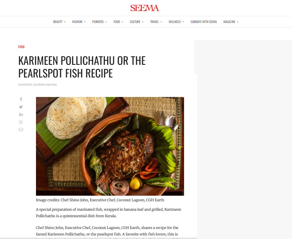 The fish is found in the backwaters of the state and is a delicacy. The fish has a high protein content and nutrition as well and is much sought after. In this recipe Chef Shino John, Executive Chef, Coconut Lagoon, CGH Earth, shares how to make the Karimeen Pollichathu is a quintessential dish from Kerala.