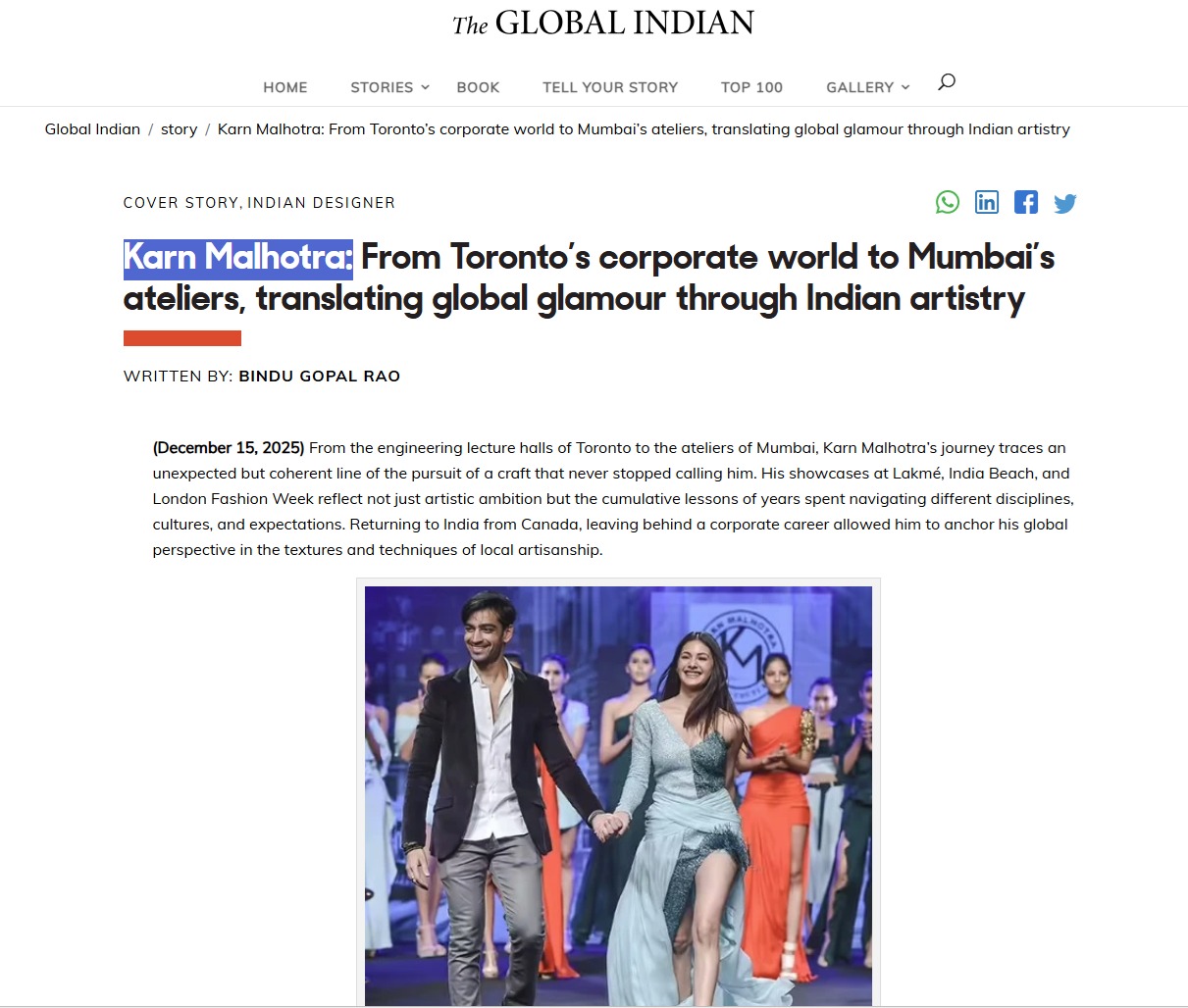 From sketching alongside his sculptor grandmother in his childhood to showcasing collections at Lakmé Fashion Week, India Beach Fashion Week, and London Fashion Week, Karn’s journey is a story of creativity, courage, and innovation , perfect for a deep-dive feature exploring the philosophy, inspiration, and artistry behind his work.​