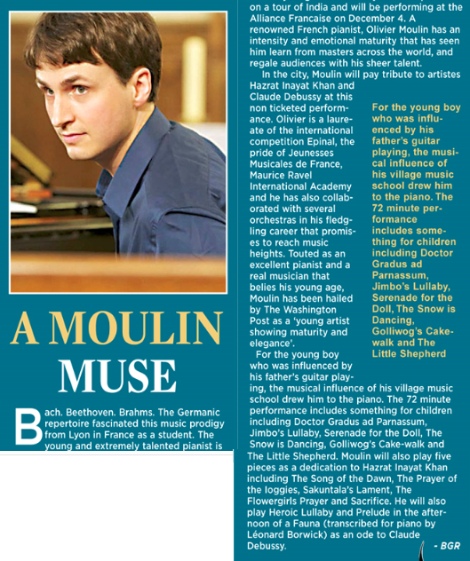 Music lovers in Bengaluru have more reason to rejoice with renowned French pianist, Olivier Moulin, coming down to perform at Alliance Francaise de Bangalore on December 4th between 7:00 pm – 8:00 pm. The artist will pay tribute to artistes Hazrat Inayat Khan and Claude Debussy and the entry to the event is free. The French pianist is a laureate of the international competition Epinal, the price of Jeunesses Musicales de France, Maurice Ravel International Academy and he has also collaborated with several orchestras. Touted as an excellent pianist and a real musician that belies his young age, Oliver has been hailed by The Washington Post as a ‘young artist showing maturity and elegance’.