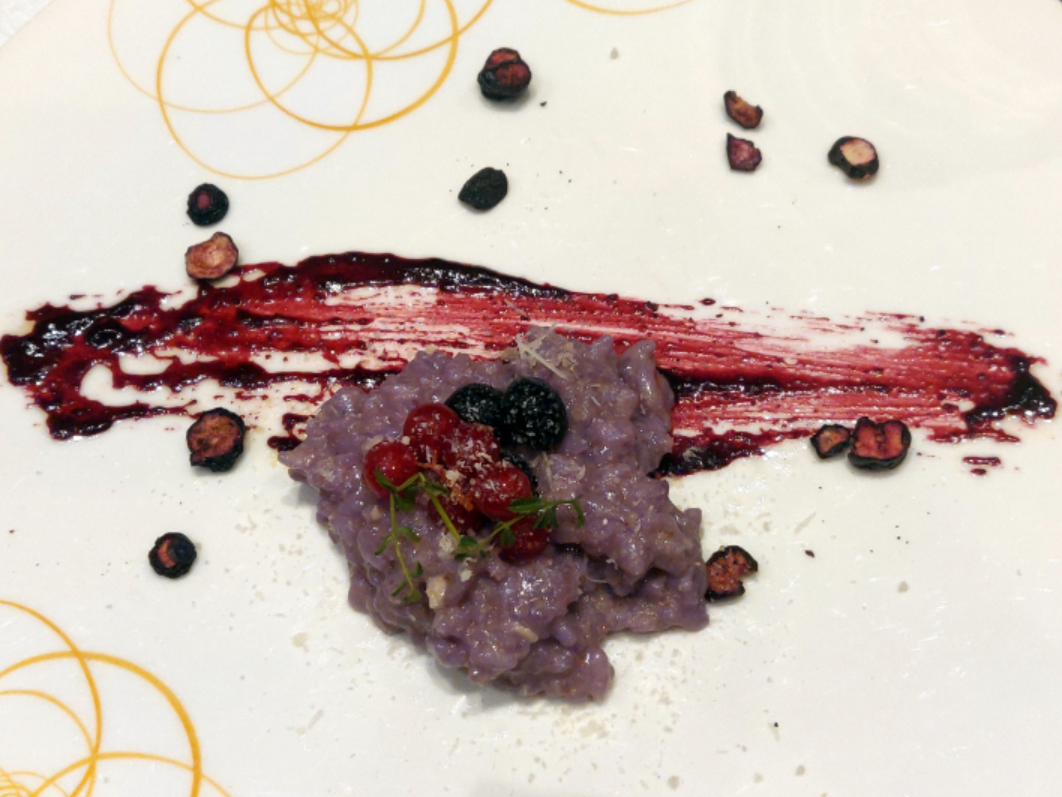 Blue pea tea risotto with blueberry compote, fresh berries soaked in grape seed oil and robiola cheese