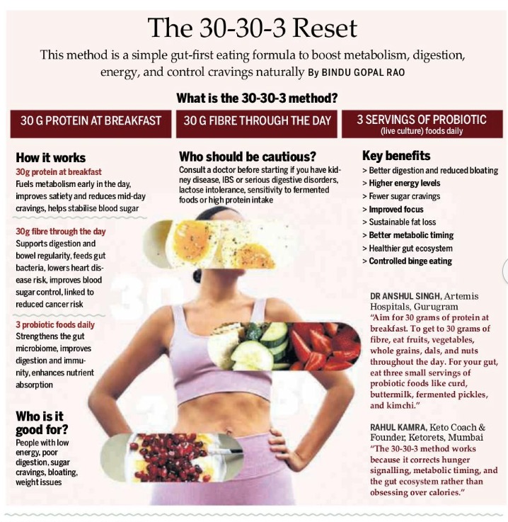 The 30-30-3 method is a structured eating framework designed to improve metabolic performance, gut health, and satiety regulation. It promotes: